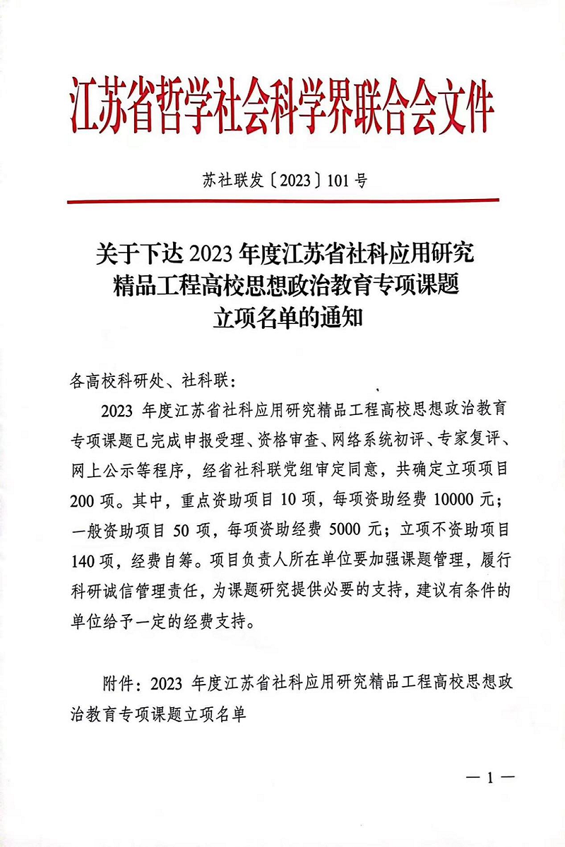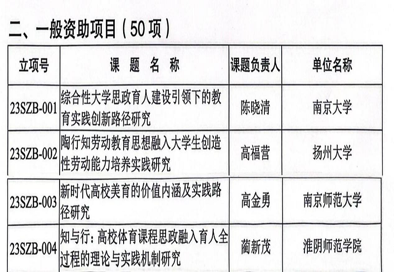 近日,江苏省社会科学联合会公布了“2023 年度应用研究精品工程高校思想政治教育专项课题”立项项目名单,本年度社科联共确定立项项目200项。其中,重点资助项目10项,一般资助项目50项,立项不资助项目140项;公司蔺新茂经理的专项课题《知与行:高校体育课程思政融入育人全过程的理论与实践机制研究》以一般资助项目第四名获得立项。
