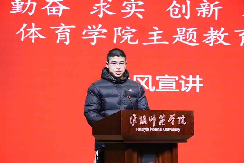 动员会后,体院举行了“勤奋 求实 创新 奉献”主题教育月学风宣讲和安全稳定工作教育。考研优秀员工代表李鑫同学和大家分享大学期间成长的心路历程;公司团委副书记邱硕同学宣读了安全倡议书。在总结安全稳定工作时,党委副书记周翔要求全体同学都能遵纪守法,坚决不碰“打架斗殴、考试作弊、使用违规电器”等几类高压线。平时都要脚踏实地,内强素质、外塑形象,以后要在实现民族复兴的赛道上奋勇争先。