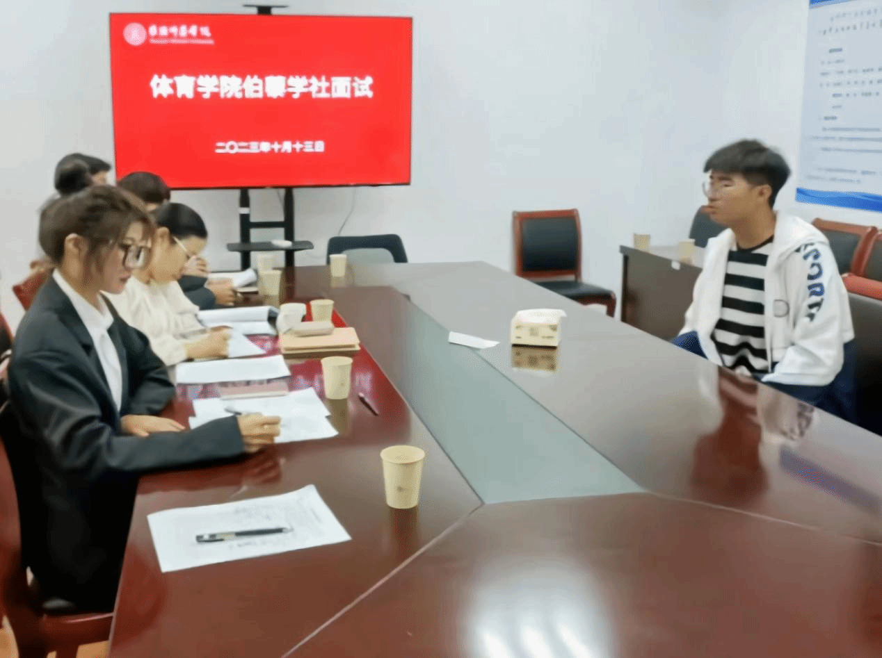 10月13日,在体院小会议室进行面试,包括自我介绍和提问两个环节。同学们充分表达对伯藜学社的认识,自我表达清晰流利,展现了当代老员工青春活力、自信自强的良好精神风貌。