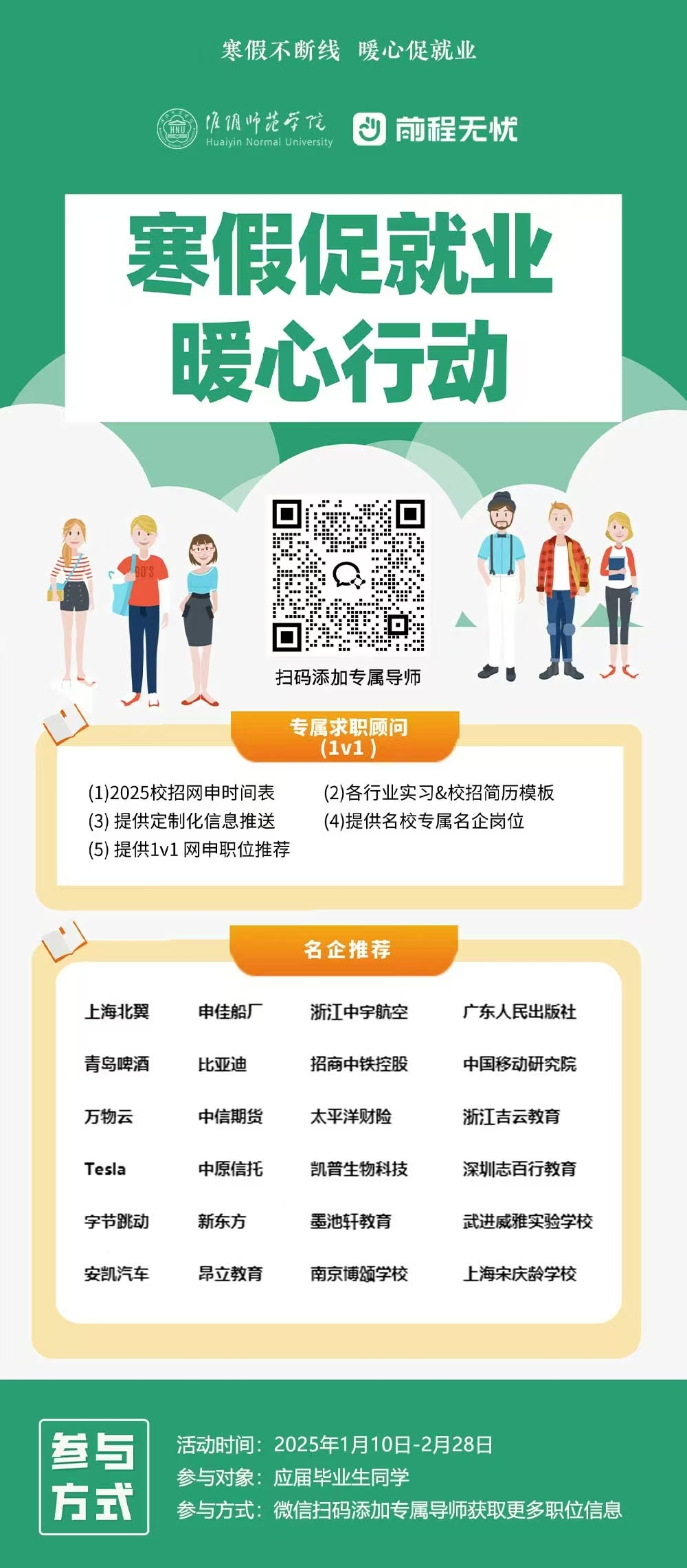 为贯彻落实党中央、国务院关于做好高校毕业生就业工作的决策部署,充分利用寒假窗口期,促进毕业生高质量就业,公司联合前程无忧举办“寒假促就业暖心行动”系列公益活动。