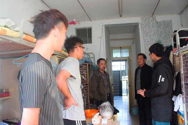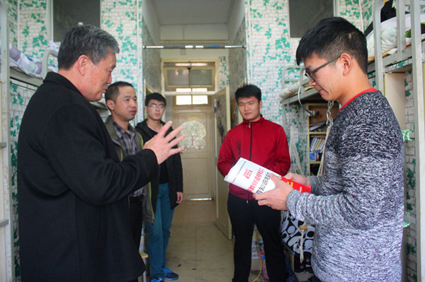公司关工委委员杨洪辉老师来到员工自习教室和员工宿舍,亲切看望了2015级师范班的同学,并叮嘱大家考试期间要劳逸结合,轻装上阵;相信自己,充满信心;按时作息,保证睡眠。公司关工委副主任丁光明老师陪同。