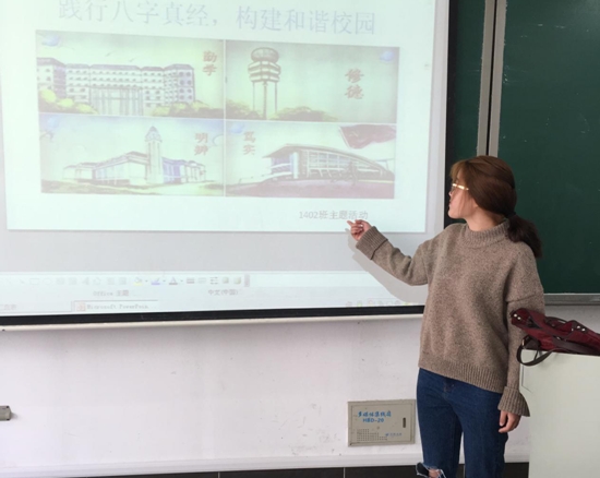 2016年4月15日上午,体院1402班的全体同学在教B—204展开了“践行八字真经,共建文明和谐校园”主题团日活动。