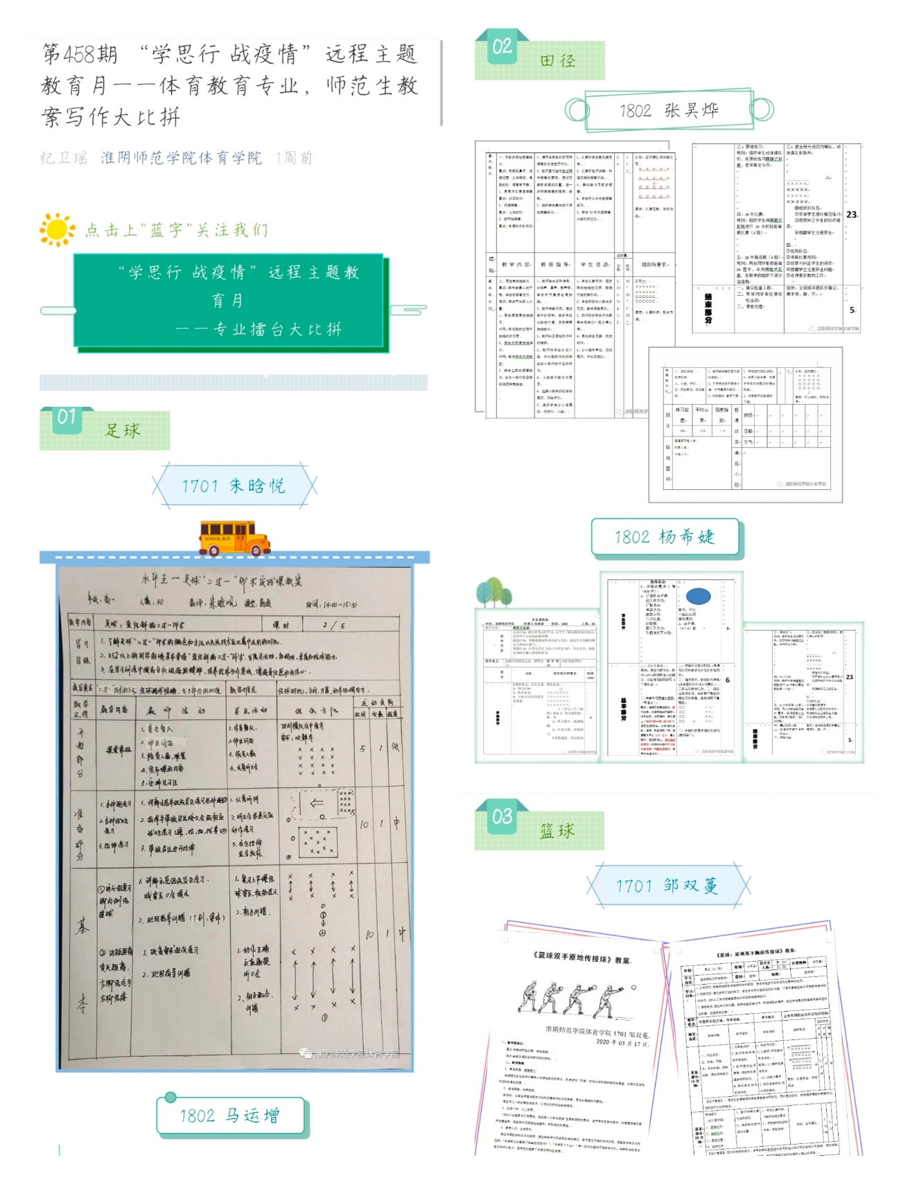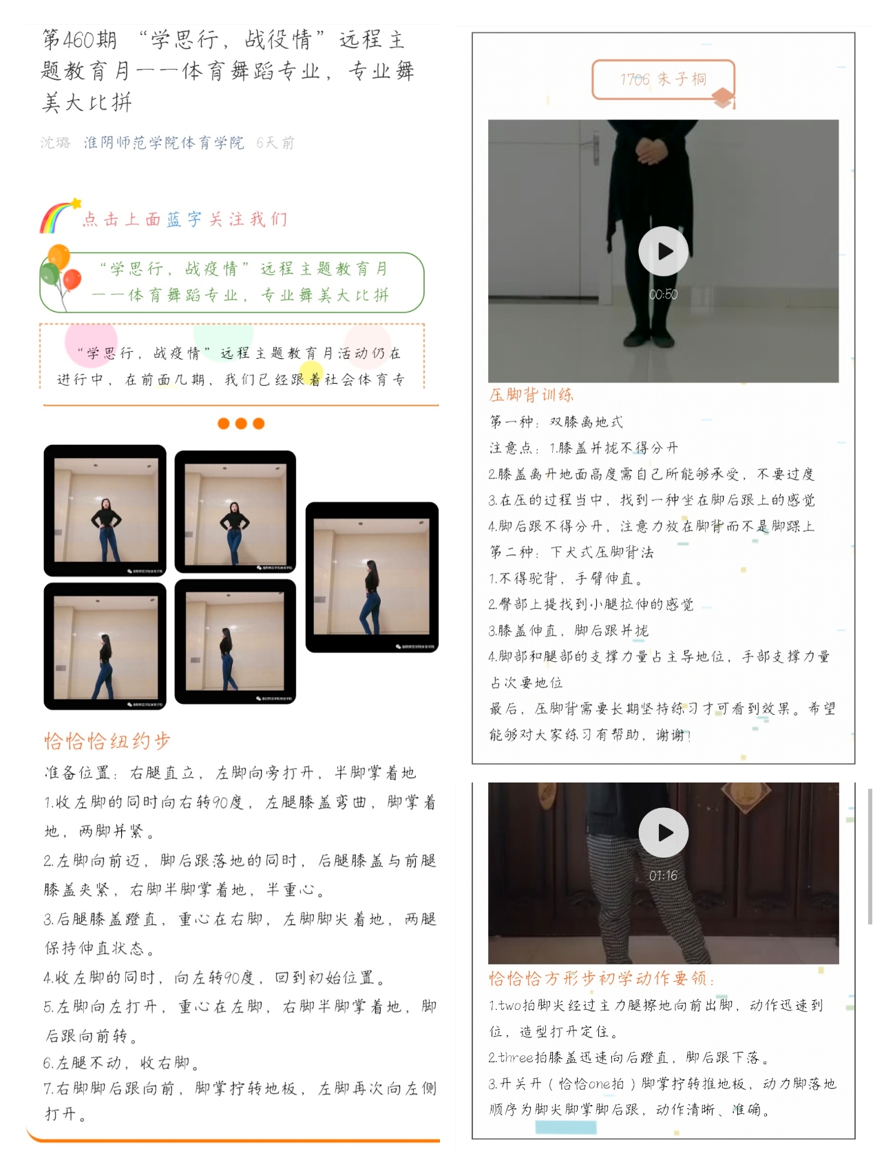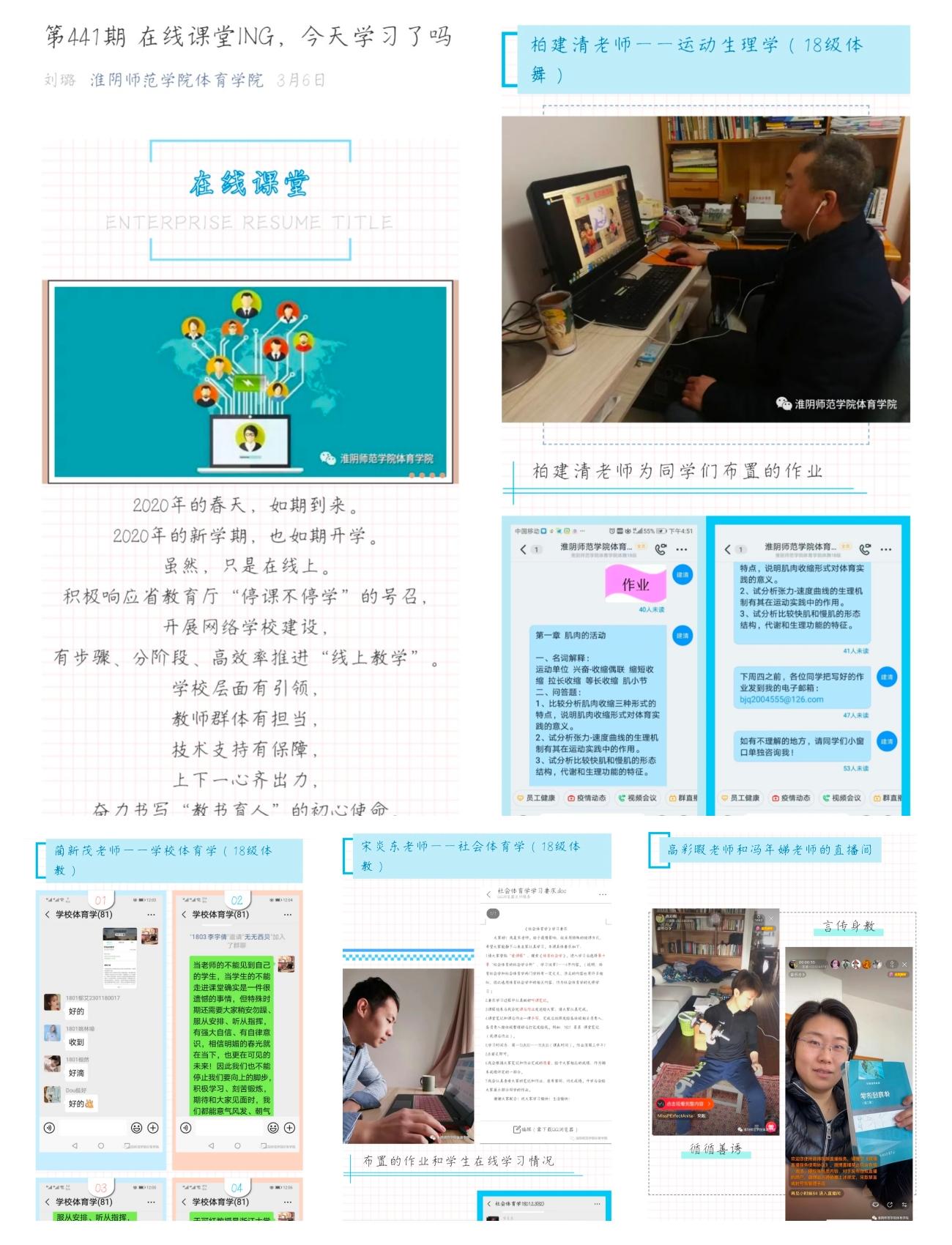 公司运用QQ、微信等新媒体平台开展疫情防控知识线上专题宣讲;教师通过爱课程、中国大学mooc、超星、智慧树、微信等软件实现在线教学;社会体育专业同学发挥专业特长在家录制简单易行的健身知识小课堂,倡导大家积极参加体育锻炼,养成健康生活方式;体育教育专业同学瞄准教团队格证面试、考编考研,利用疫情期间在家认真打磨一份教学教案,并分享学习成果;体育舞蹈专业同学发挥专业特长,进行“专业舞美大比拼”。