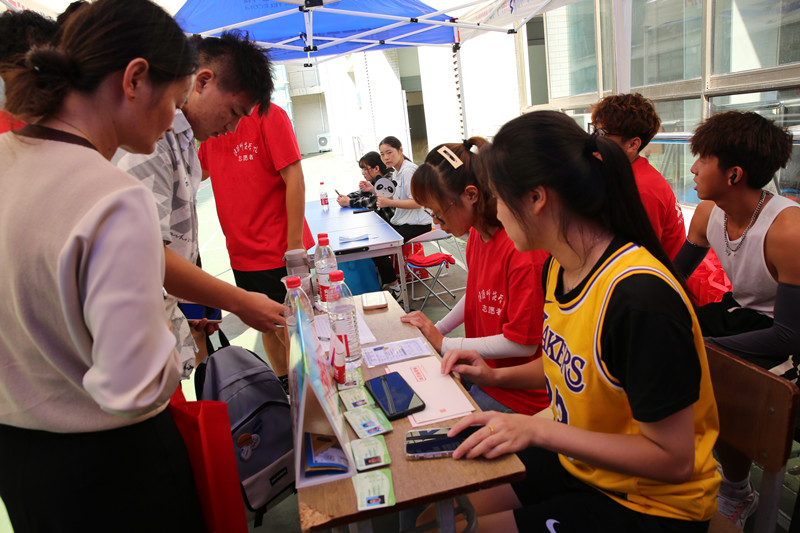 在新生报到处,学长学姐们始终耐心倾听新生的诉求并积极给与帮助,充分体现体院对新生同学的关怀。