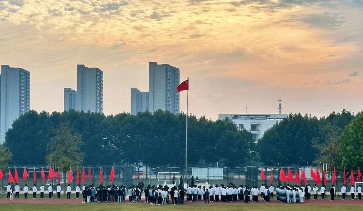 迎晨曦,沐朝阳,7时15分,升旗仪式正式开始,在雄壮的国歌声中,鲜艳的五星红旗冉冉升起,全体人员庄严地向国旗行注目礼、齐唱国歌。