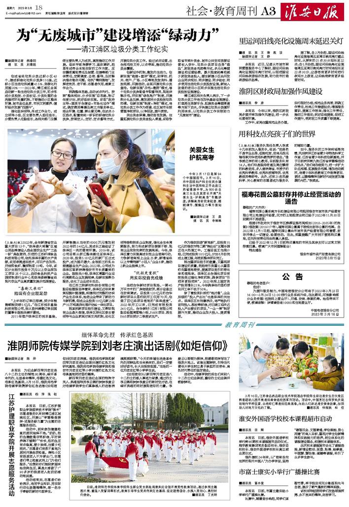 淮安日报2023年3月18日:日前,必一运动bsport体育师生联合党支部赴周恩来纪念馆开展党性教育活动,通过参观主题图片展、重温入党誓词等形式,教育引导员工党员传承红色基因、坚定理想信念、永葆入党初心、勇担时代使命。 ■通讯员 丁光明