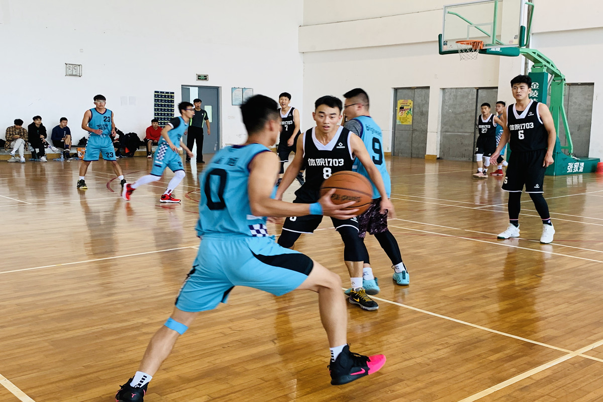 馆外寒风逼人,枯叶遍地,馆内光线明亮,欢呼声不断。在篮球馆的西场是1703对战1705,1705班全员奋力拼搏,凭借默契的传球,娴熟的运球和不懈的坚持,以42:30的优异成绩领先1703班。在东场是1802对战1905,整场赛事双方比分不相上下,十分激烈。最终1802班以46:42的比分战胜1905班。